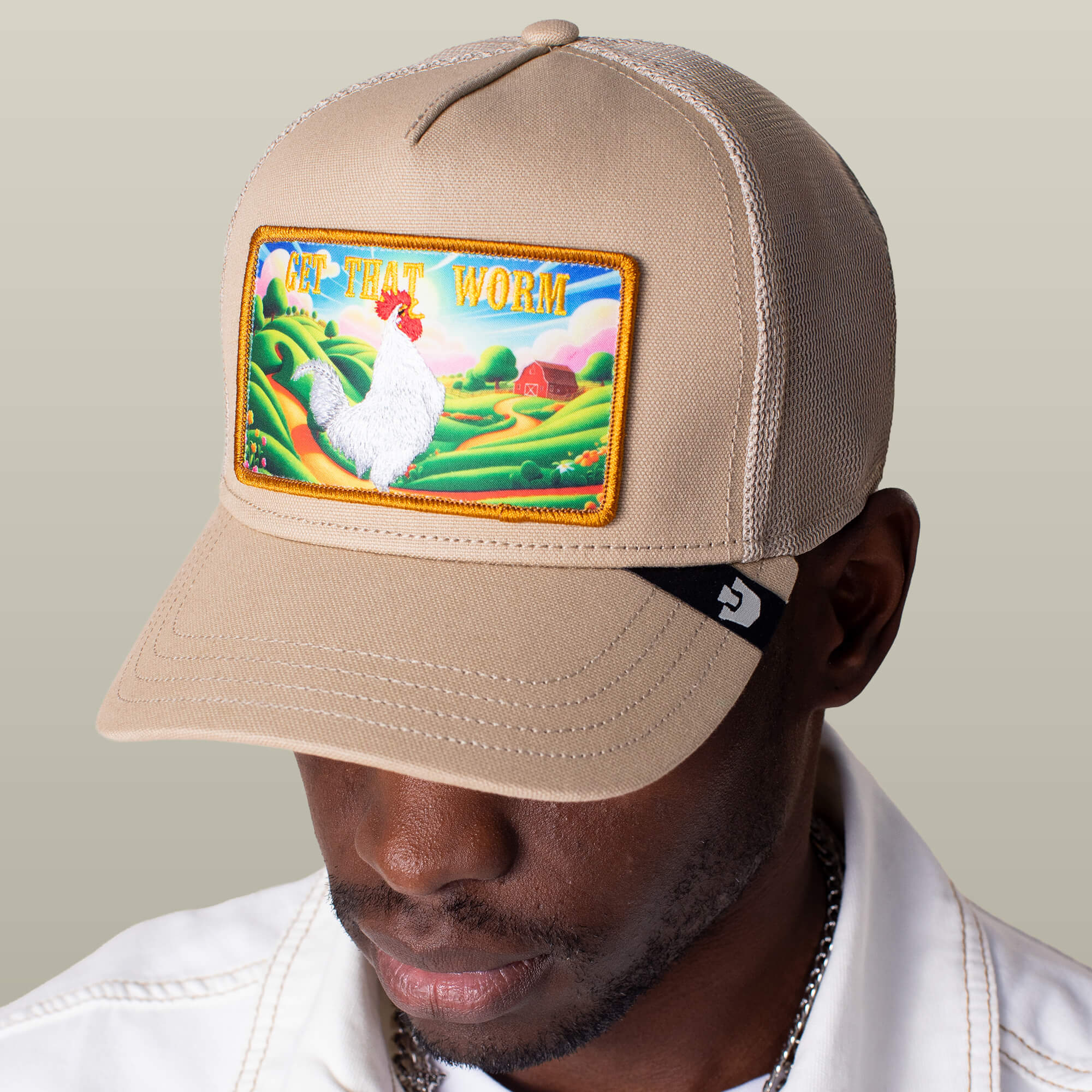 Get That Worm features a bold farm scene with a strutting rooster front and center and the words stamped loud across the top. Bright rolling hills. A red barn in the distance. Zero hesitation in the foreground.