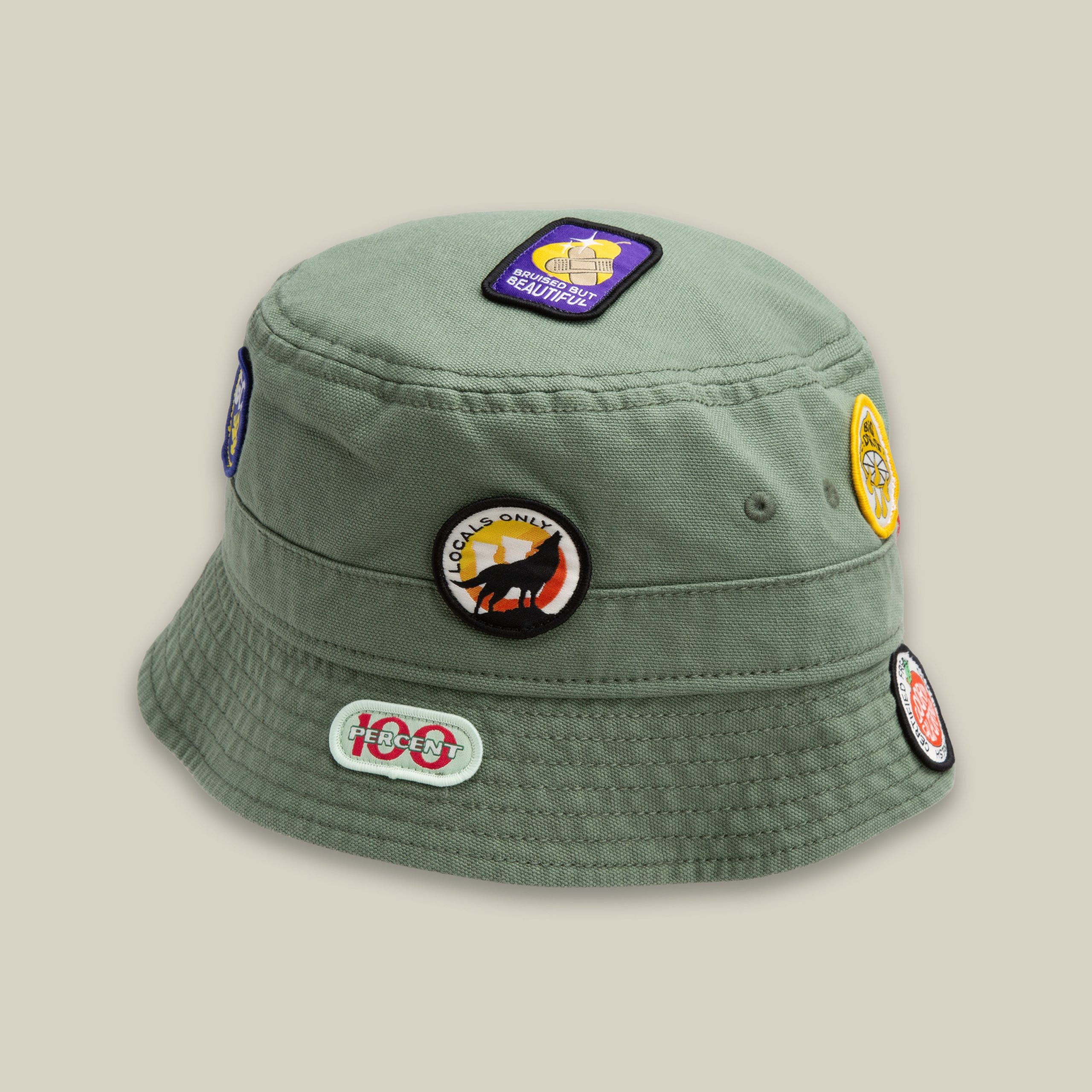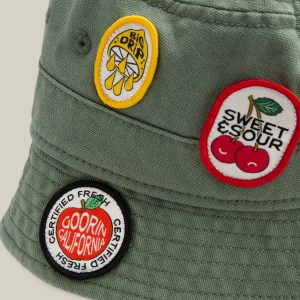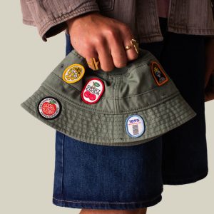 This olive green bucket collects receipts. Covered in mismatched patches and loud opinions, it’s a walking bulletin board for early birds, go bananas energy, certified fresh ideas, and a few thoughts you probably didn’t ask for. Wear it like a souvenir from everywhere and nowhere, because subtle was never the point.