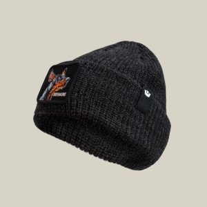 Black knit cuffed up with a Doberman patch that doesn’t sugarcoat it—guard dog vibes only. Heavyweight warmth with a sharp edge, this beanie says “approach with caution” while keeping you comfortably covered.