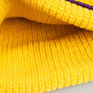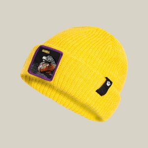 High-voltage yellow knit with a coiled snake patch framed in purple. Fierce, fast, and venomous in spirit—this beanie strikes just as hard as it warms.