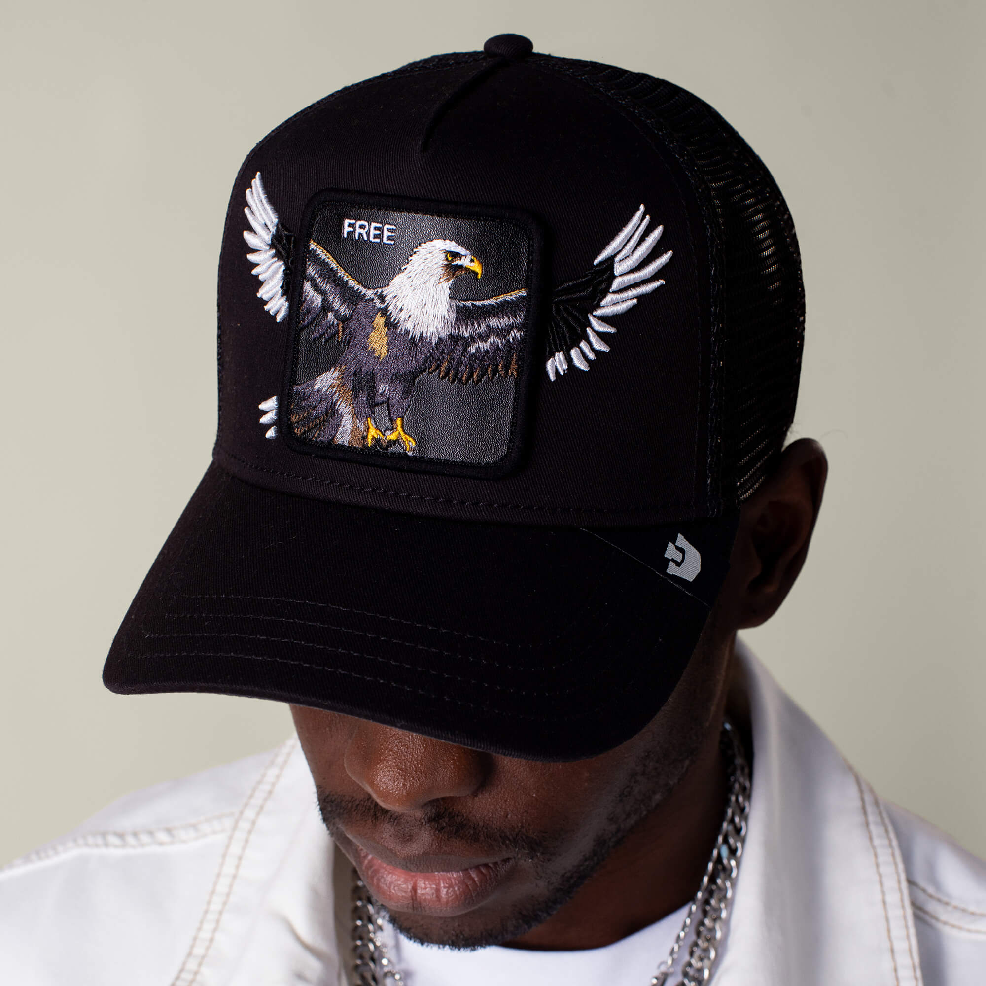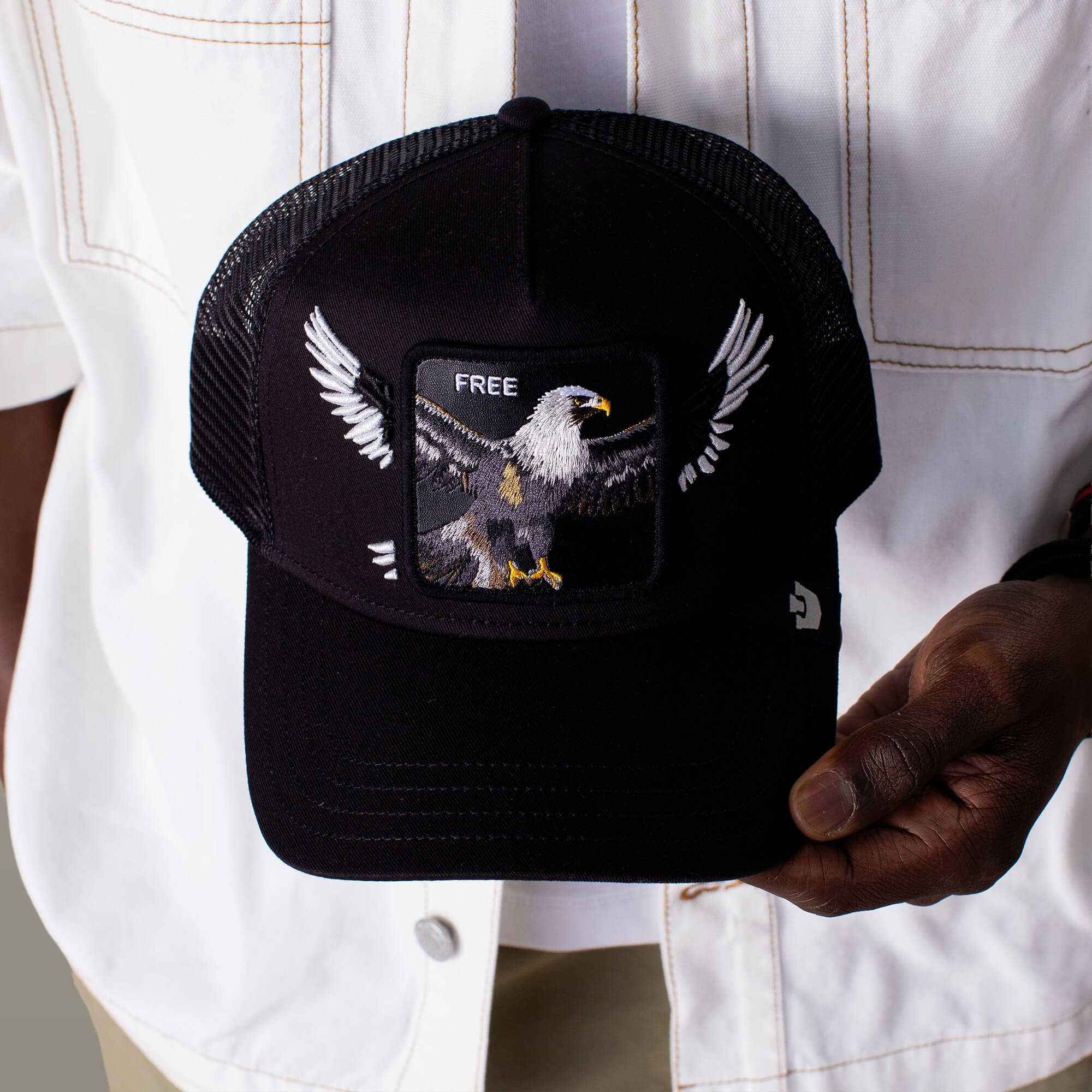 The Wings Free trucker hat features a bold eagle with outstretched wings and the word FREE stitched above it. High-contrast embroidery pops against a clean black front panel, with wing details extending beyond the patch for extra lift.