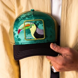 Bright green meets tropical attitude on this Belize Toucan, a vivid trucker that doesn’t believe in blending in. The embroidered toucan patch says VISTOSO loud enough, backed by leafy green patterning, tan mesh, and a black bill that keeps it grounded. Call it green, call it jungle, call it toucan energy, this one’s made for being seen and not apologizing for it.