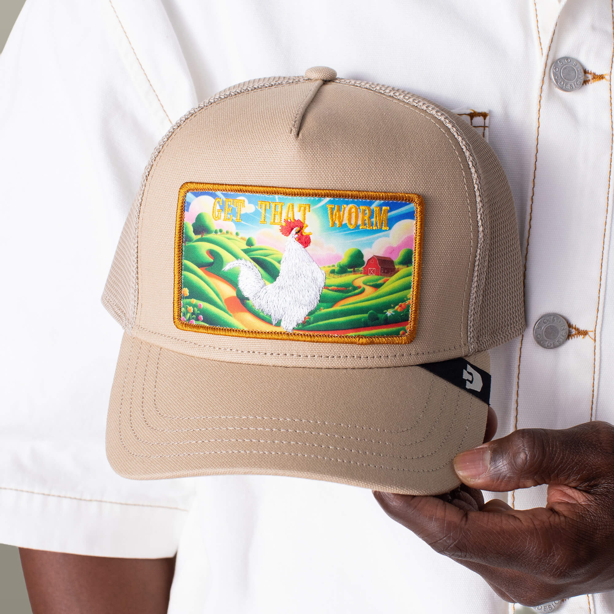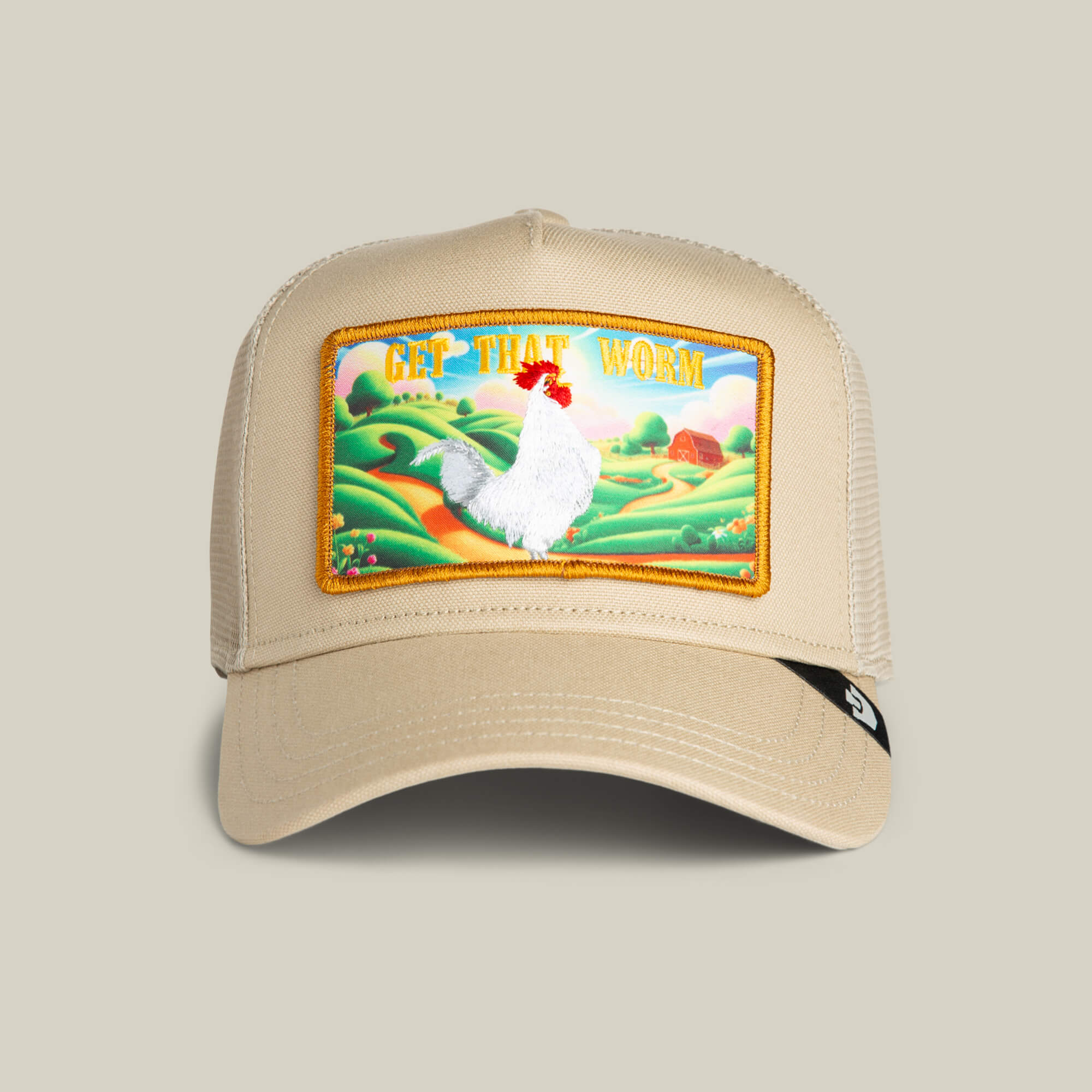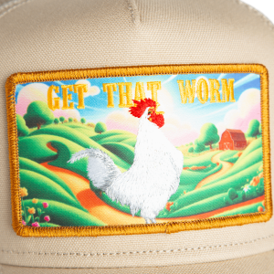 Get That Worm features a bold farm scene with a strutting rooster front and center and the words stamped loud across the top. Bright rolling hills. A red barn in the distance. Zero hesitation in the foreground.