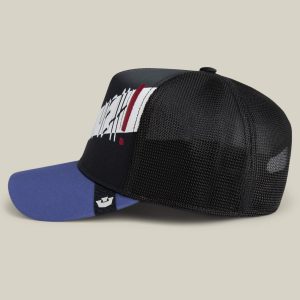 This hat doesn’t shout. It circles. It scribbles. It underlines itself and then casually crosses it back out. That diagonal slash? That’s a thought in motion. The lips on the brim? They’ve got stories they’re not telling.
