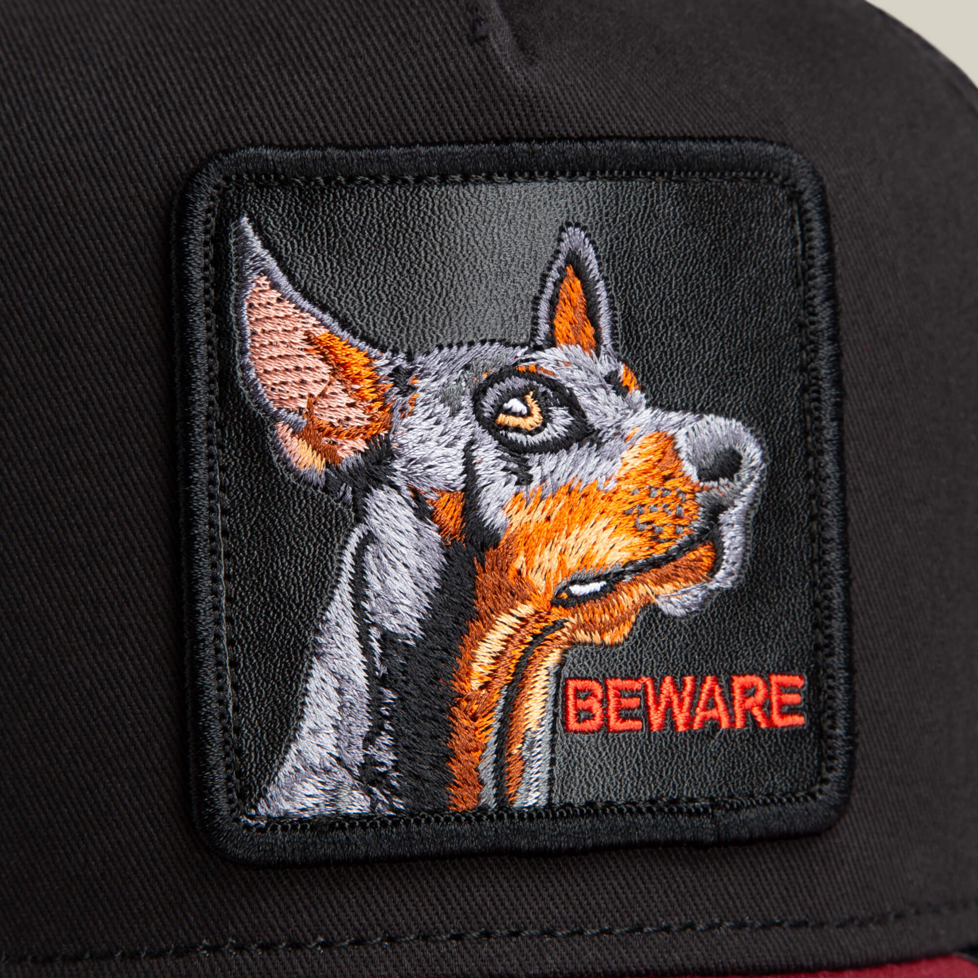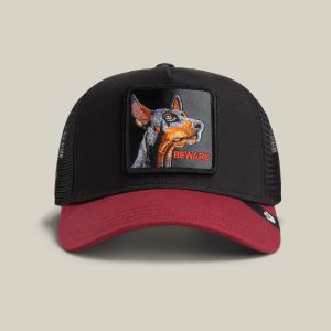 A classic trucker in black or white with a dog patch stamped BEWARE, because the warning is the point. Ears up, eyes sharp, patience already gone. Clean colorways, dog patch threat, and a reminder that friendly is optional.